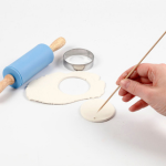 Trin 1: Brug en kagerulle til at rulle leret ud i en tykkelse mellem 0,5 og 1 cm. Brug en udstiks form til at udstikke en cirkel.  Husk at lave et lille hul til ophæng.
